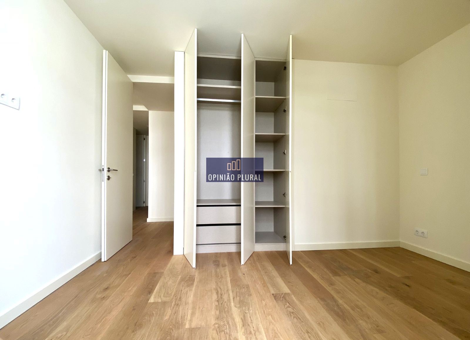 O quarto, tranquilo e bem dimensionado, dispõe de roupeiro embutido, sendo complementado por uma casa de banho completa com acabamentos contemporâneos. A existência de um segundo roupeiro reforça a capacidade de arrumação, um detalhe cada vez mais valorizado.