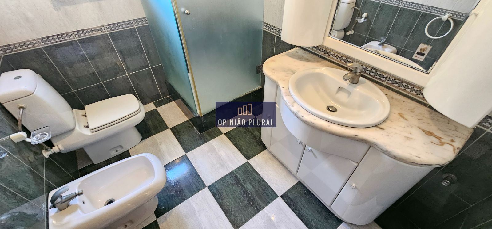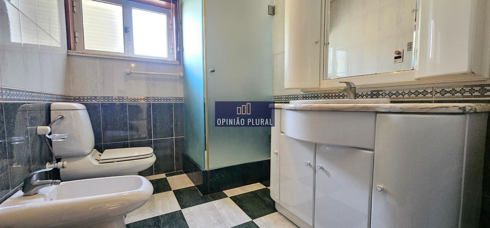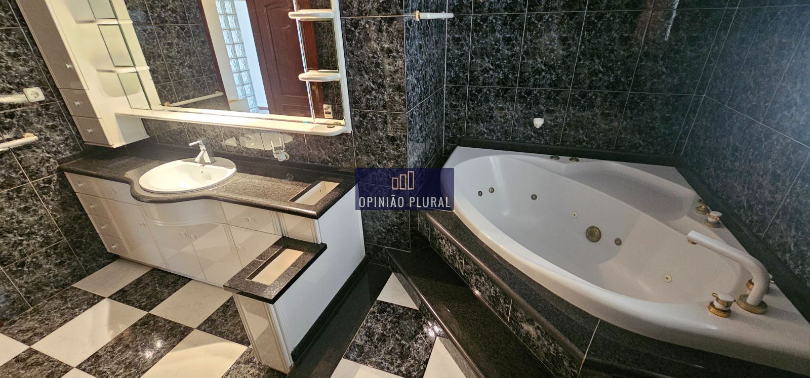 • Quatro instalações sanitárias, com louças suspensas, banheira de hidromassagem, base de duche com resguardo, móveis lacados e misturadoras monocomando