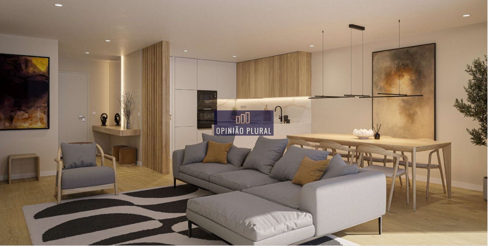• Sala ampla em open space, com acesso direto à varanda orientada a Nascente/Poente, garantindo excelente luminosidade natural