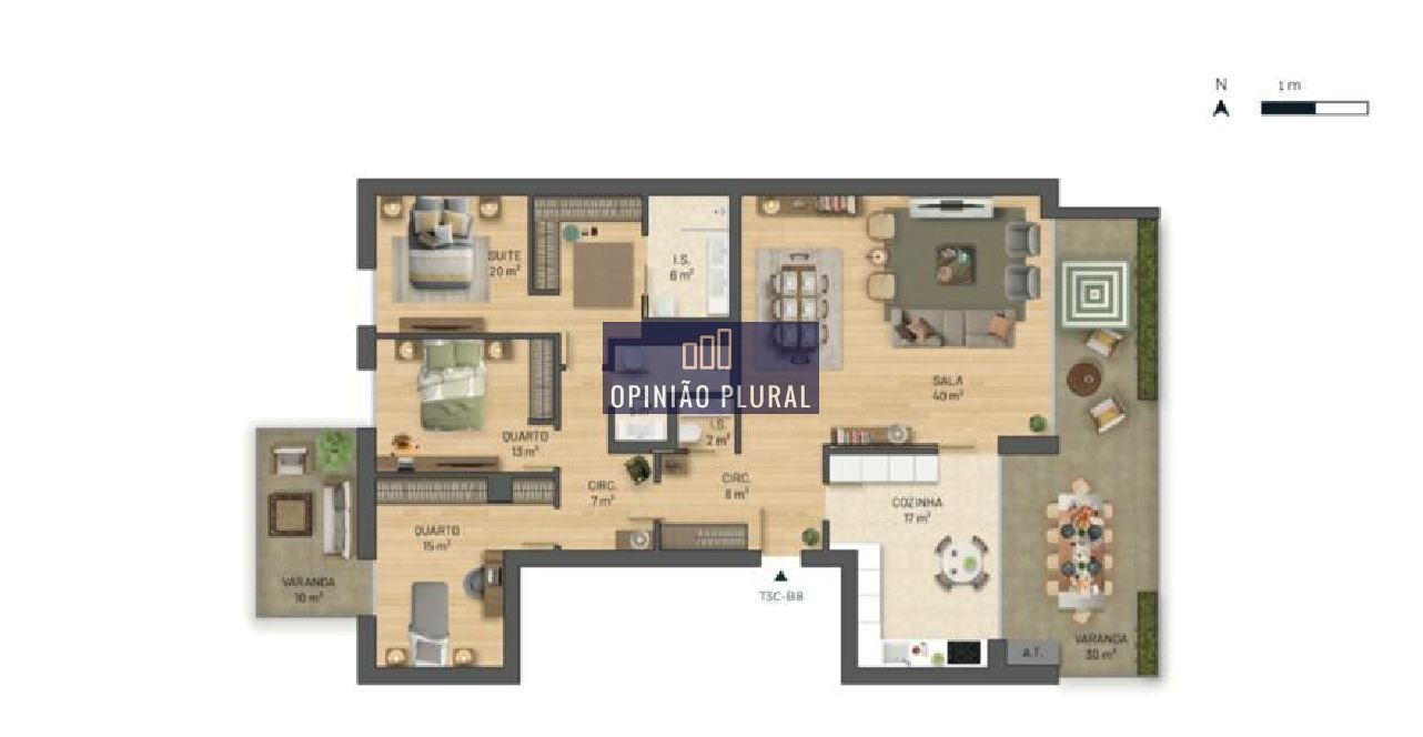 A fração inclui ainda garagem para dois carros e arrumos, garantindo total funcionalidade no dia a dia.